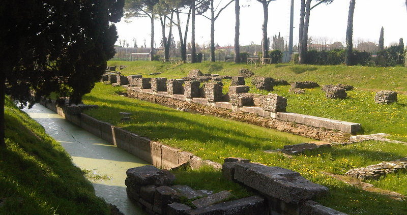 Si notino le due banchine sul lato ovest: in pietra d’Istria (la più resistente all’azione corrosiva delle acque), erano lunghe circa 300 metri (la banchina sulla sponda est fu invece rinterrata dopo gli scavi).