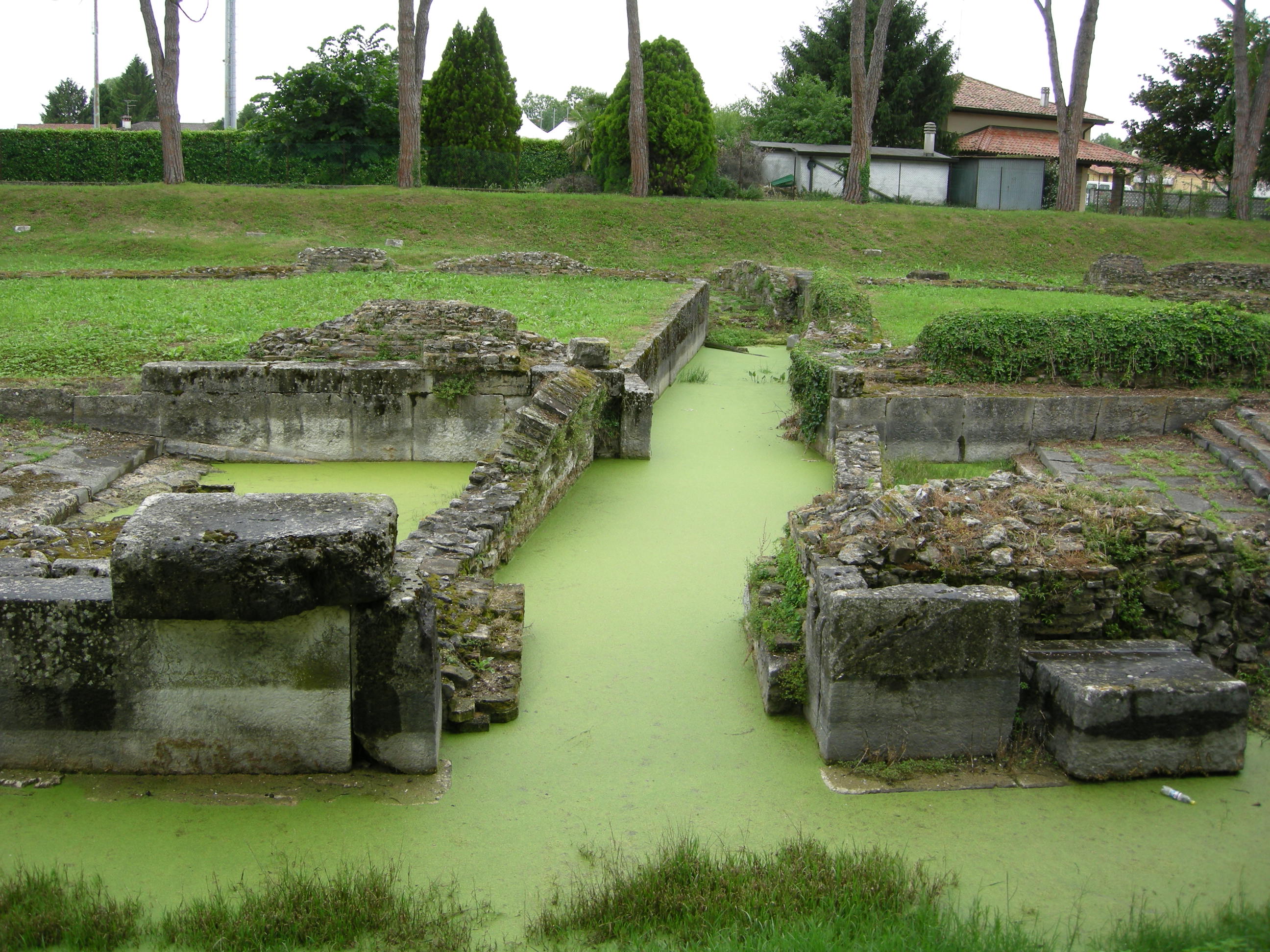 Si notino le due banchine sul lato ovest: in pietra d’Istria (la più resistente all’azione corrosiva delle acque), erano lunghe circa 300 metri (la banchina sulla sponda est fu invece rinterrata dopo gli scavi).