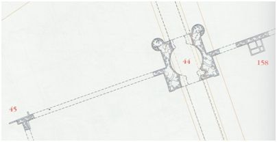 L’accurato rilievo dell’epoca, mostra con chiarezza la struttura muraria e il suo inserimento, all’interno di elementi di spoglio, ad esempio nell’angolo sinistro in basso e nella parte frontale (fig. 2).
