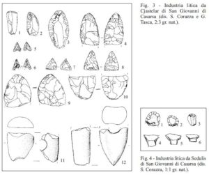 In corrispondenza del settore settentrionale dell’area occupata dall’abitato protostorico, ma soprattutto all’esterno del suo margine nordoccidentale, è stata recuperata a più riprese abbondante industria litica.