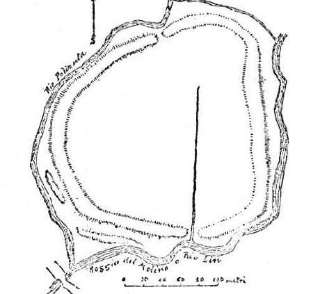 Da quanto è ancora rimasto e dal disegno fatto dal Tellini circa quaranta anni fa, i base al quale ho anch’io indicato nel mio disegno le arginature che non esistono pù, si può dedurre che dovevano essere di poca entità, forse non molto più alte di un metro. Sorge perciò il dubbio che si tratti non di castelliere difeso contro assalti nemici, ma solo di opera di difesa contro alluvioni straordinarie.