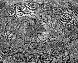 La zona meglio conservata presenta un riquadro con inscritte due corone concentriche; appoggiate alla corona esterna troviamo tre colombe, di cui una tiene nel becco una foglia a tessere rosse incorniciata da tessere nere; quella opposta, in realtà non visibile, è probabile che per simmetria sia uguale e quindi dovrebbero essere 4. All’interno della prima corona, una linea sinuosa racchiude foglie di vite alternate a grappoli d’uva, stilizzati in forma di cuore a fondo nero con inserti bianchi, alternate da altre a fondo bianco con inserti neri. La corona più interna racchiude invece una cornice circolare a matassa con inserti di tessere rosse negli spazi lasciati liberi dagli intrecci. Questo elemento era in uso già nei pavimenti musivi di epoca romana del I sec. d.C. e ripreso diffusamente in età longobarda anche nella scultura. Al centro è raffigurata una palmetta a tessere rosse con sette fronte; la base è decorata da due ricci che trovano continuazione nel cerchio interno. Anche questo è un elemento decorativo antico, presente sui vasi fitti a figure rosse del V sec. a.C. in area greca e come decorazione parietale anche in quella minoica. Qui è ripreso con accezione religiosa come albero della vita, rosso come il sangue versato dal Cristo per la nostra salvezza. In alto a ds un medaglione racchiude dei gigli stilizzati.