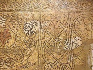 Il nostro mosaico sintetizza perfettamente tutto ciò: presenta un disegno prevalentemente in tessere nere su fondo bianco e inserimenti di tessere rosse. E’ suddiviso in riquadri separati da elaborati intrecci, di derivazione islamica ma elaborati da complicate volute che sono un elemento caratteristico della decorazione in epoca longobarda e che sono più evidenti nella scultura e soprattutto nella toreutica (arte di lavorare i metalli) in cui i Longobardi erano veri maestri.