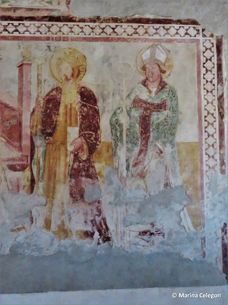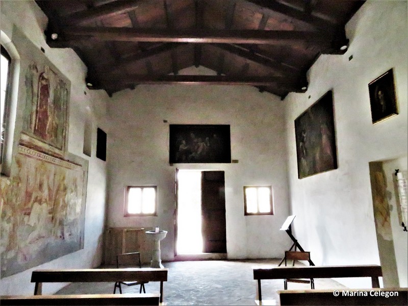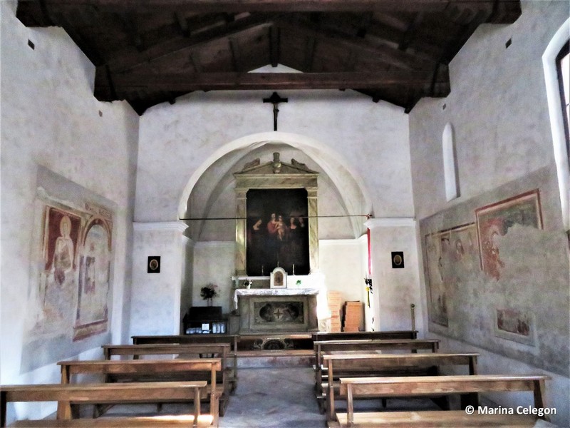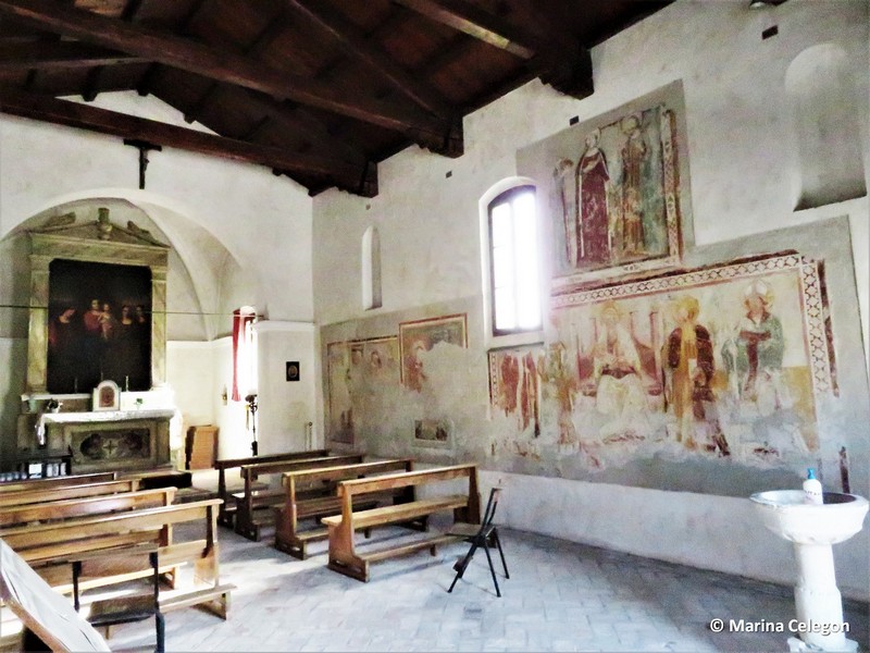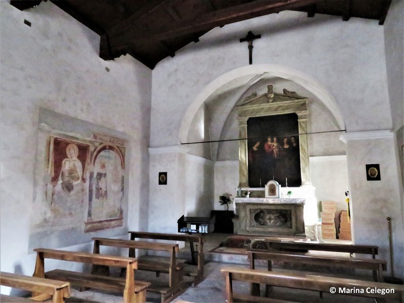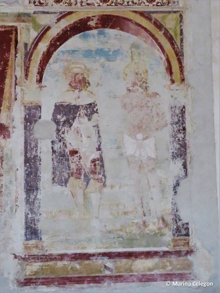 San Rocco e San Sebastiano. A ridosso del presbiterio si vedono le immagini piuttosto rovinate dall’umidità dei Santi Rocco e Sebastiano. San Rocco è vestito con gli abiti tipici del pellegrino, con un mantello scuro e un cappello a falde. San Sebastiano è legato ad un alberello. Questi due santi raffigurati assieme sono connessi alle pestilenze. Al di sotto durante i restauri è emersa una ragnatela di graffiti e monogrammi lasciati per invocare l’aiuto in epoca di pestilenze o lasciati da pellegrini in transito. Il più antico è datato al 1442. Gli affreschi sono ritenuti da alcuni autori un’opera giovanile di Giovanni Antonio de’ Sacchis detto il Pordenone e per questo databili all’inizio del XVI secolo.