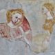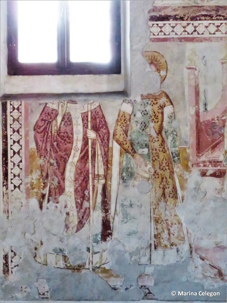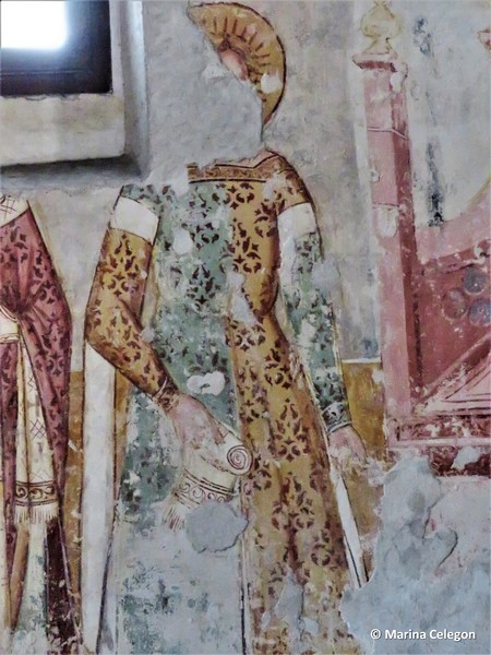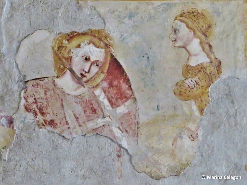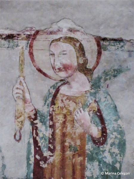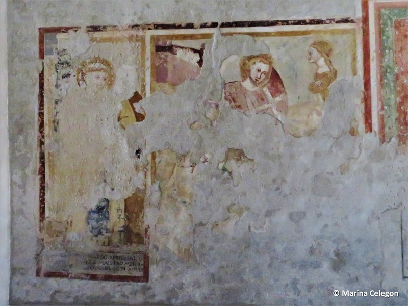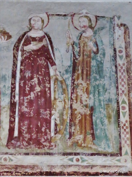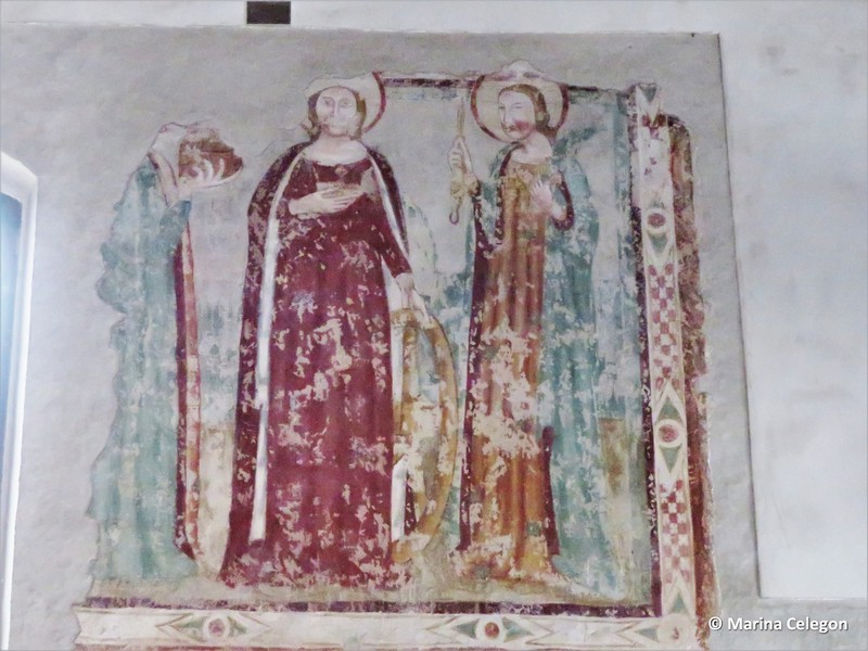 Affresco con tre sante. In alto c’è un riquadro con la raffigurazione di tre sante rivolte verso chi guarda, con in mano i rispettivi attributi. Quella di sinistra è in parte scomparsa. Al centro campeggia la figura di Santa Caterina d’Alessandria appoggiata alla ruota strumento della sua tortura, con una tunica rossa e un mantello. La terza figura, identificata dalla tradizione con Sant’Apollonia, indossa un semplice abito che scende in morbide pieghe e un lungo mantello. L’affresco è stato datato al 1360 circa ed è attribuito ad un pittore friulano che concilia la monumentalità propria del giottismo della prima metà del Trecento diffuso anche in Friuli con gli esempi forniti dagli aiuti di Vitale da Bologna.