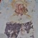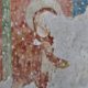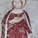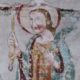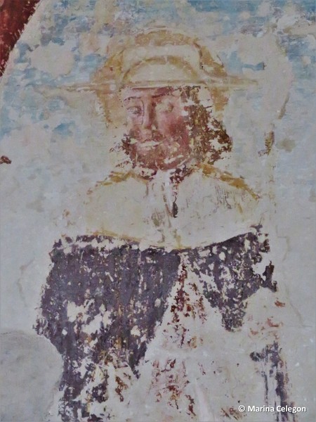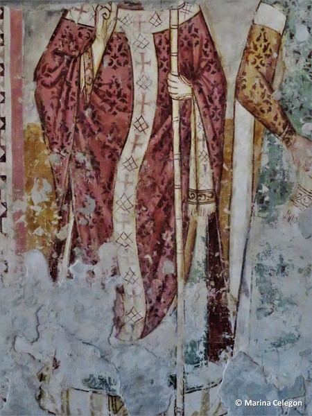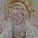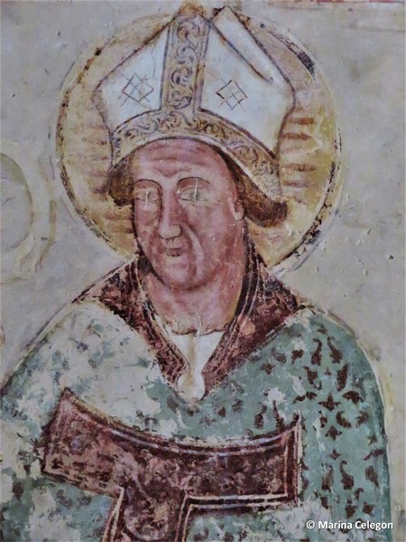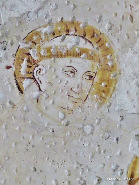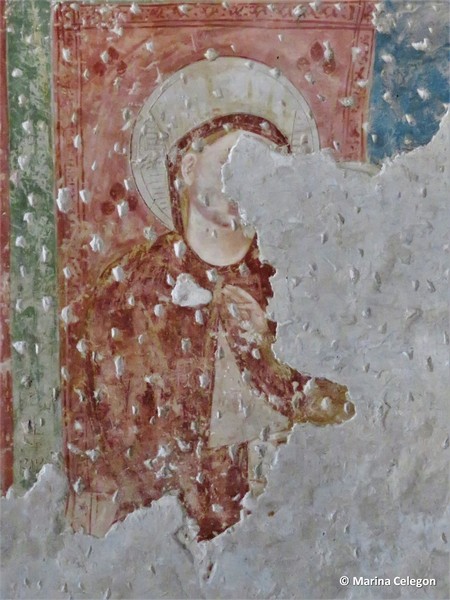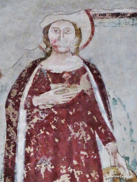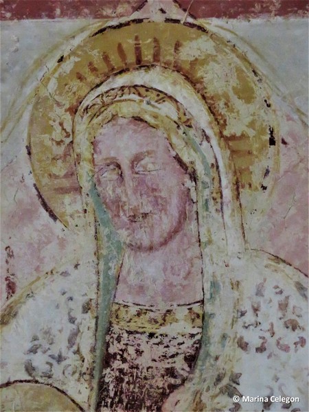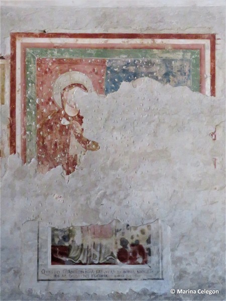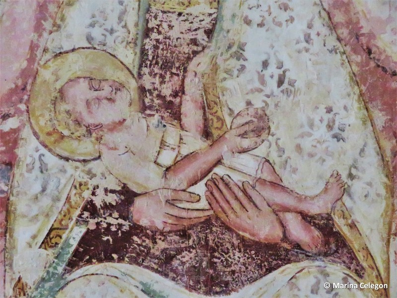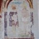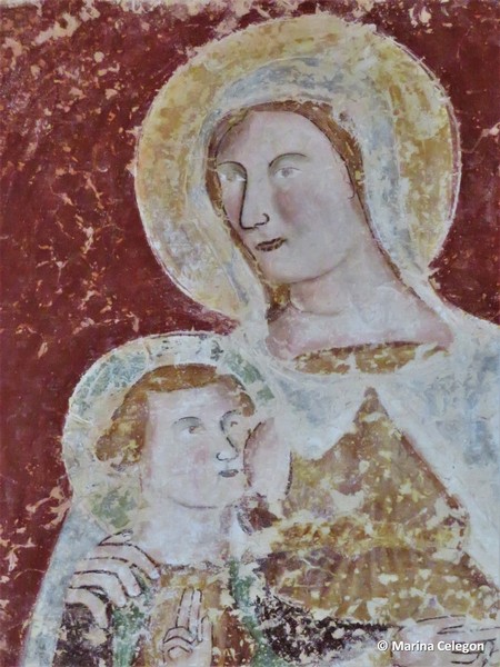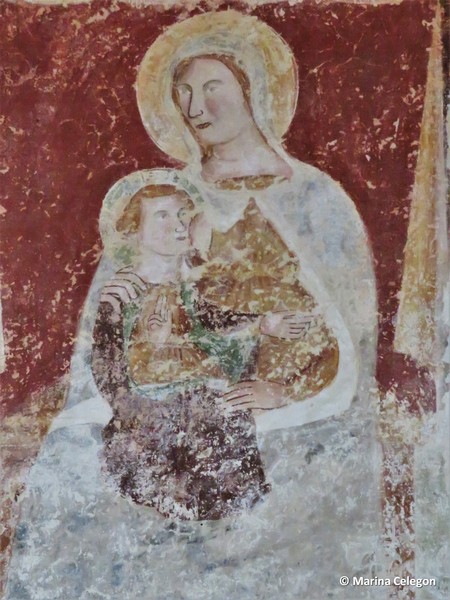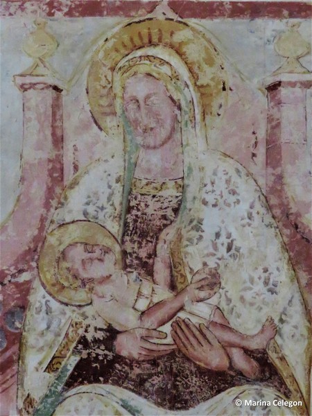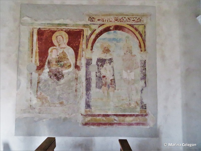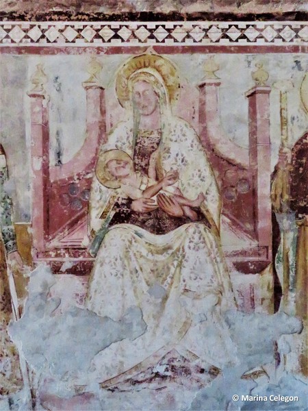 Madonna in trono. A destra del San Giorgio si trova un riquadro in gran parte perduto nel quale è ancora riconoscibile la Vergine seduta in trono contro un drappo rosso parzialmente decorato racchiuso da una cornice verde. In un’epoca più tarda su tale riquadro venne sovrapposto un altro affresco decisamente più tardo del quale rimane una iscrizione datata 1608. La Madonna è ritenuta più antica degli altri affreschi presenti sulla parete. Si ritiene che anticamente questa raffigurazione non fosse isolata ma costituisse una di una serie di altri riquadri oggi ricoperti dagli attuali affreschi.
