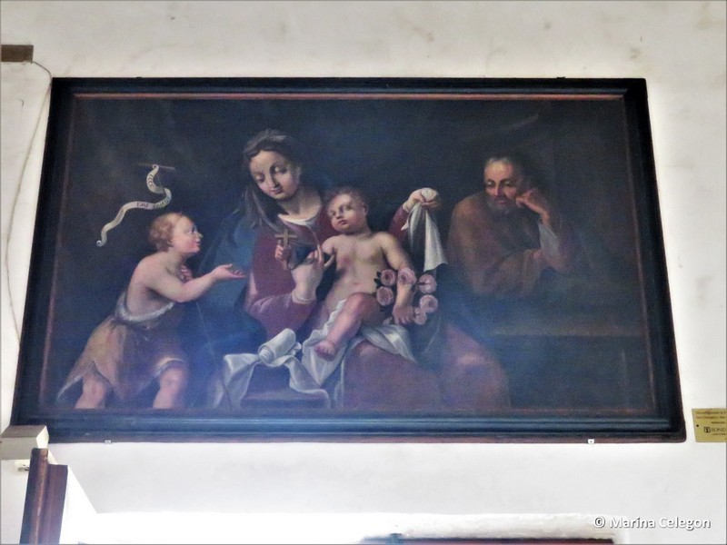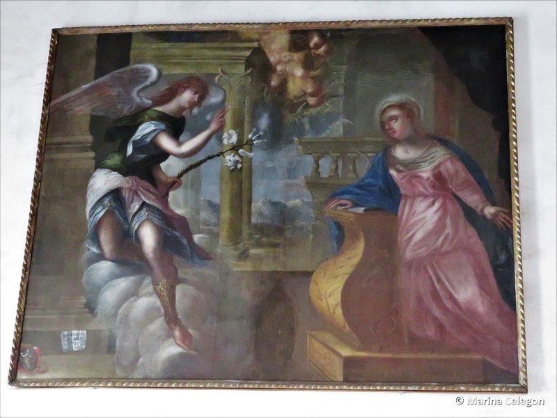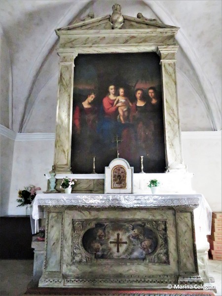 Sull’altare in pietra, realizzato nel 1750 dal portogruarese Pietro Balbi, vi è una pala con la Madonna con il bambino e le sante Caterina, Agata e Lucia attribuita ad un pittore veneto della prima metà dell’Ottocento. Sulla parete destra vi è un’Annunciazione di Domenico de’Soldi (1680) e sopra la porta d’ingresso una settecentesca Sacra Famiglia con San Giovannino di Giuseppe Buzzi.