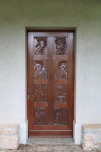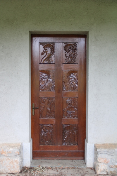 La facciata liscia è a forma di capanna ed è completata da un piccolo campanile a vela leggermente sporgente rispetto alla parte sottostante. Elemento particolarmente interessante è il portone d’ingresso: di forma rettangolare, in legno e ad anta unica, è diviso in otto scomparti uguali decorati da bassorilievi. La maggior parte di questi rappresentano simboli e figure ecclesiastiche ma uno, in posizione centrale, presenta la raffigurazione della chiesa stessa nella quale è possibile riconoscere la facciata con il suo campanile.