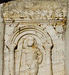 Un blocco di calcare squadrato è murato in alto sopra il rilievo, vicino alla grondaia.