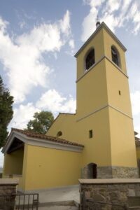 Sul lato destro si innalza un campanile di modeste dimensioni, concluso da cuspide piramidale acuta; la sua realizzazione, di epoca più tarda, rivela un gusto semplice e popolare.