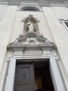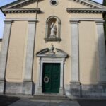 La facciata a capanna è ripartirà verticalmente da quattro lesene con colonne di ordine dorico e al centro di apre il portale d’ingresso sormontato da un’architrave sul quale è incisa l’iscrizione proveniente dalla vecchia chiesa che ne ricorda la data di edificazione.