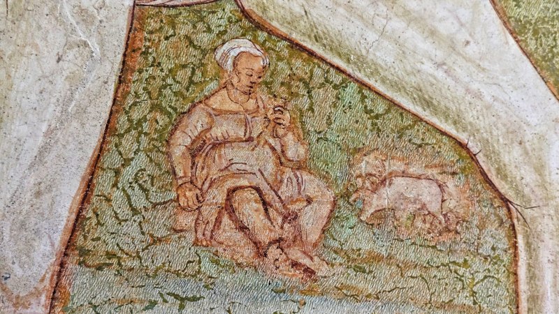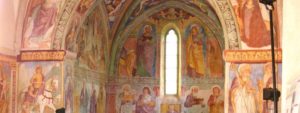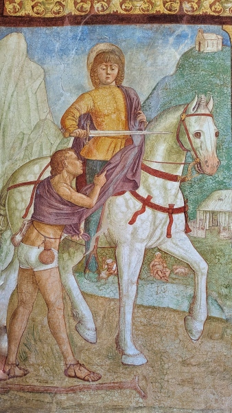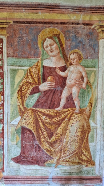 All’interno, sulla parete sinistra, una splendida Madonna della Mela, probabilmente realizzata da Pietro da San Vito, collaboratore di Gianfrancesco da Tolmezzo. Splendidi i dettagli dell’affresco di San Martino (il lavaggio dei panni nel Tagliamento, la donna con il maialino). Conserva anche un importante ciclo d’affreschi di Gian Francesco da Tolmezzo, raffigurante i Dottori della Chiesa, Santi e Sante, ed il Martirio di S. Lorenzo, opera datata al 1492.