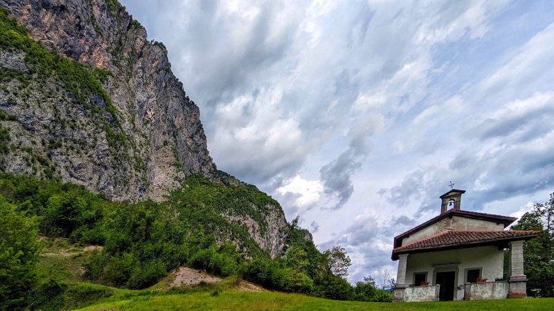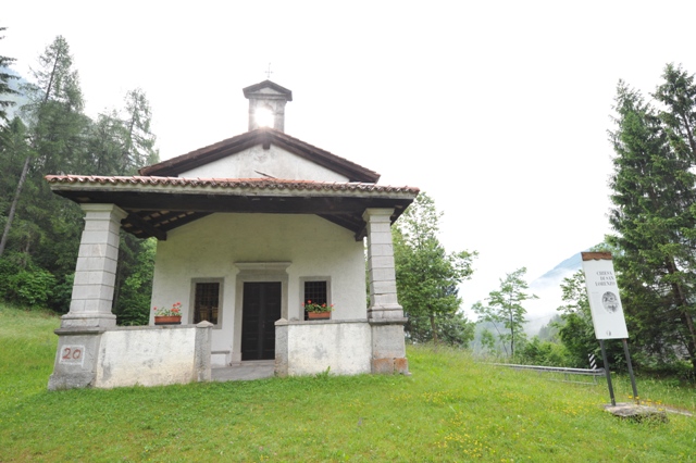 La chiesa venne costruita, su un pianoro tra le montagne del Passo della Morte (come suggerisce il nome, si trattava di una zona molto pericolosa per la caduta di massi) ed il Rio Clavenò, a quasi 2 km dal capoluogo ed a protezione e come rifugio per coloro che lavoravano lungo il vicino Tagliamento, per il trasporto del legname.