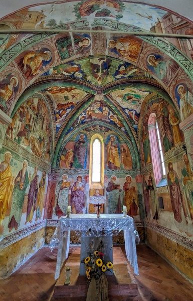 L’atrio è stato ricostruito recentemente (1960). La muratura è in sassi, con intonaco rinnovato. La copertura è ancora in coppi.