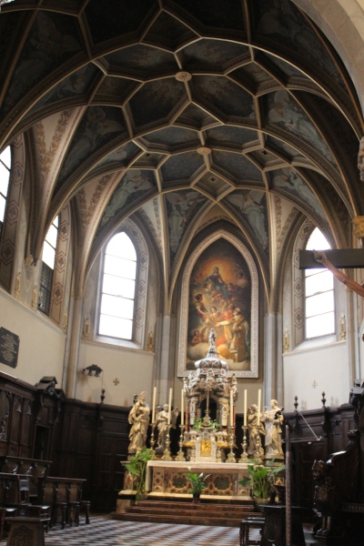 La struttura dell’originaria cappella dedicata a San Ilario costituisce l’odierno presbiterio della cattedrale e conserva, almeno in parte, l’originaria struttura e forme decorative gotiche del tardo-medioevo evidente soprattutto nelle due campate concluse dai semiottagoni. Il soffitto è interamente decorato da immagini di angeli che reggono i simboli della Passione o strumenti, mentre al centro della volta vi sono i simboli di Alfa e Omega che circondano la croce di Aquileia. L’altare maggiore è dell’inizio del Settecento ed è inquadrato dalle statue dei due Santi patroni della cattedrale; sopra di esso è presente la pala dell’Assunta del 1820 di G. Tomiz.