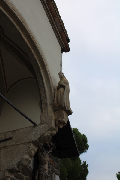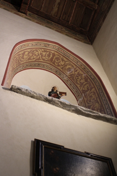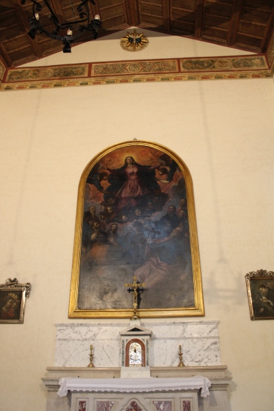 All’interno il crocefisso ligneo è la copia dell’originale, oggi conservato nei Musei Provinciali, introdotto all’inizio del Seicento. Sopra l’altare è posizionata la rappresentazione dell’Assunzione, datata agli inizi del XVII secolo, che è stata attribuita al figlio di Jacopo Tintoretto, Domenico. L’abside centrale è costituito da un arco a tutto sesto; è interessante evidenziare come la parte inferiore dell’arco sia decorata, da ambo i lati, con la rappresentazione in pietra di angeli che reggono gli stemmi delle due famiglie inserite in scudi. Il soffitto della stessa è poi decorato dalla raffigurazione dello stemma della famiglia Rabatta cui è stato aggiunto il tema delle ali.