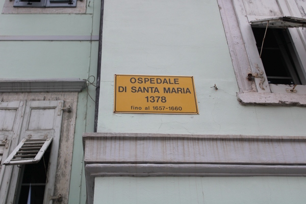 Il primo riferimento della sua esistenza è contenuto in un contratto di compravendita datato il 22 aprile 1376 nel quale compare la dicitura “in villa Gorieiae ante ospitale Sanctae Mariae”; successivamente, nel 1378, si ha un chiaro riferimento all’ospedale: la struttura viene descritta come un punto di ricovero per malati, perlopiù dedicato a donne, ma al tempo stesso anche area di sostegno per i poveri, situata vicino all’antica chiesetta di S. Ilario (oggi Duomo di Gorizia) in prossimità della piazza del mercato. L’ospedale era, inoltre, associato ad una cappella dedicata a Santa Maria.