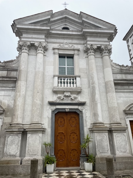 L’attuale facciata della chiesa risale alla prima metà del Settecento; la parte centrale è definita da due grandi semicolonne ioniche poste su alti zoccoli e sormontate da un timpano definito al centro da un piccolo rosone decorato con il motivo ornamentale a voluta. Le due strutture laterali più basse sono, invece, decorate da statue che rappresentano la Fertilità e la Speranza.