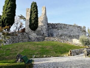 La vista dei resti del mastio, che si stagliano sullo sfondo del viale che si addentra tra le due barchesse settecentesche, merita la sosta. Questa configurazione è datata attorno al Mille, ma è basata su di una struttura molto antica, fatta risalire da alcuni studiosi all’VIII secolo, come confermato dal ritrovamento di monete romane al suo interno.