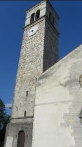 La chiesa si trova in un’area sopraelevata, adiacente al centro del paese. Il campanile, con muri a secco in ciottoli di fiume squadrati e non, è probabilmente più antico rispetto al rifacimento quattrocentesco della chiesa. Considerata la sua forma a torre, potrebbe essere stata una torre d’avvistamento della cortina. Infatti, lo spessore dei muri alla base è di circa 1 m e sulla parte interna a sud è visibile la porticina, in seguito murata.