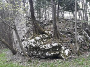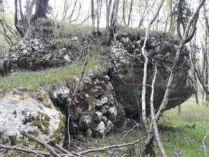 I grandi massi dopo la fine dell’ultima glaciazione erano caduti a decine lungo le pendici del M. Raut e si erano fermati lungo il versante. La maggior parte dei piccoli e medi blocchi di calcare furono spostati nel XVII secolo per organizzare l’espansione delle terre coltivate di Poffabro, ma i massi più grandi furono in gran parte riutilizzati per costruire orti e coltivi rialzati contornando i massi con dei muretti a secco che tenevano all’interno il terreno coltivabile.