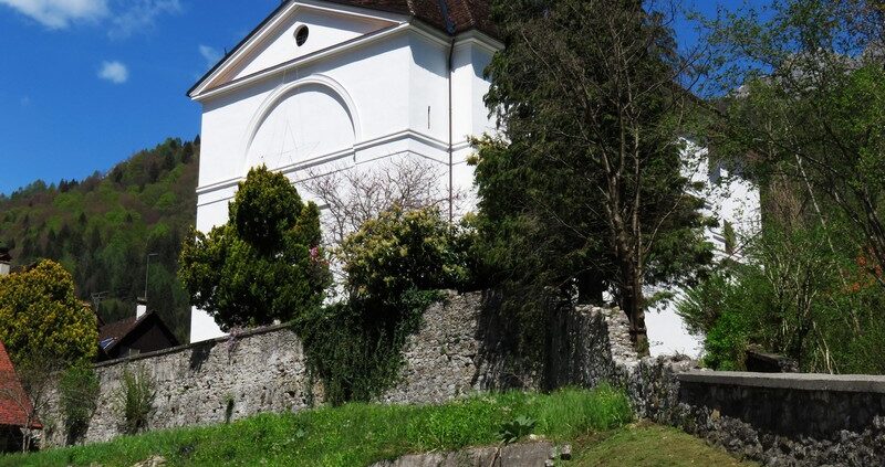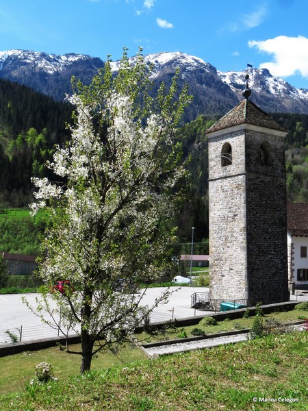 Alcuni antichi disegni collocano a sinistra del campanile e dirimpetto alla vecchia parrocchiale un’altra piccola chiesa dedicata a San Sebastiano che si dice fosse completamente affrescata e ospitasse un grande altare gotico dedicato ai Santi Fabiano, Sebastiano e Rocco, in legno scolpito e dipinto. Questo altare, come altre opere salvate dalla rovina delle vecchie chiese venne spostato nella nuova parrocchiale, collocata più in alto a dominare il corso del fiume e l’antico campanile.