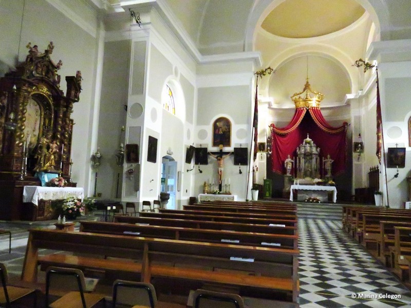 La pavimentazione è in lastre di pietra rettangolari di misura variabile. Sull’aula si aprono quattro finestre, due all’interno dei bracci e due nel presbiterio. Sulle pareti laterali si aprono due porte. Il soffitto è voltato a vela.