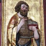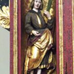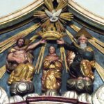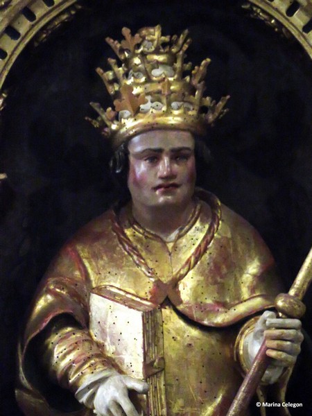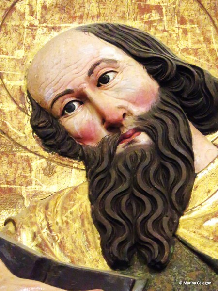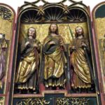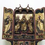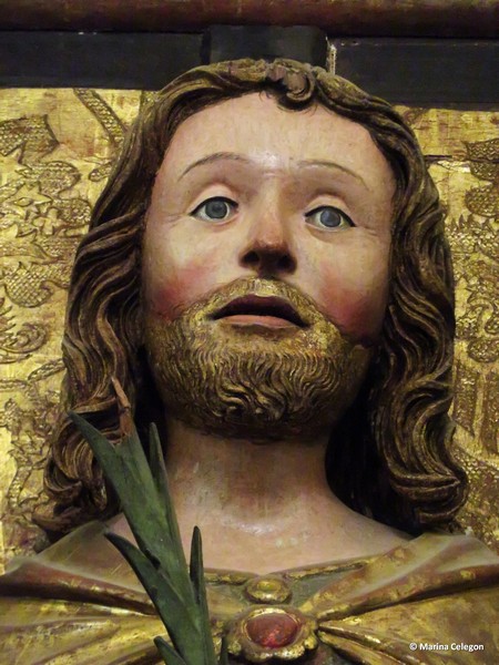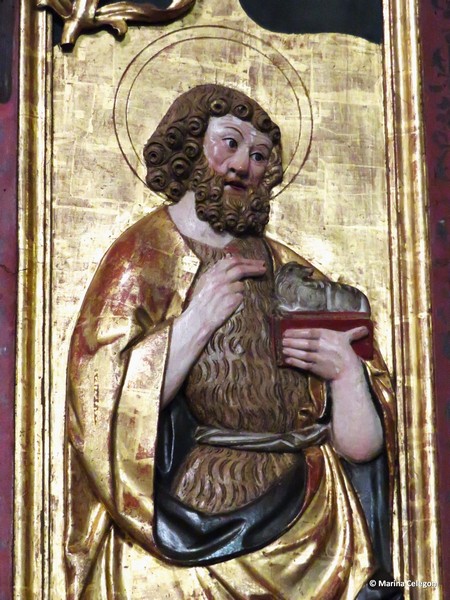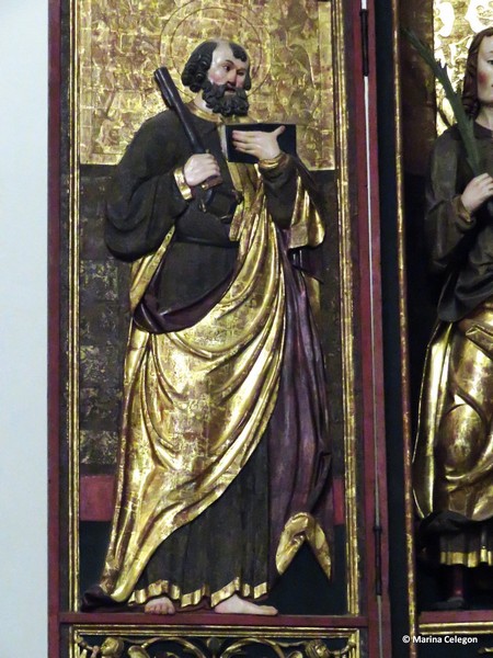Nella parte superiore lo spazio dello scrigno è riempito completamente dalle tre statue a tutto tondo dei santi martiri aquileiesi, con espressioni incerte e svagate e caratteri di realismo un po’ provinciale. Sulle grandi ali a sportelli aperti sono visibili le figure scolpite in leggero rilievo dei Santi Pietro e Paolo, a sportelli chiusi quelle dipinte dei Santi Giacomo e Bartolomeo. Sul retro dello scrigno sono dipinte le figure di Adamo ed Eva.