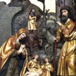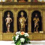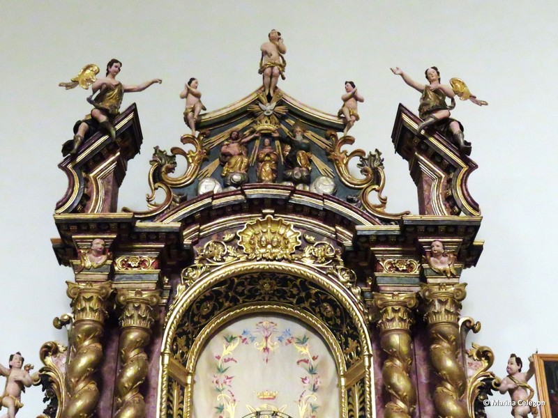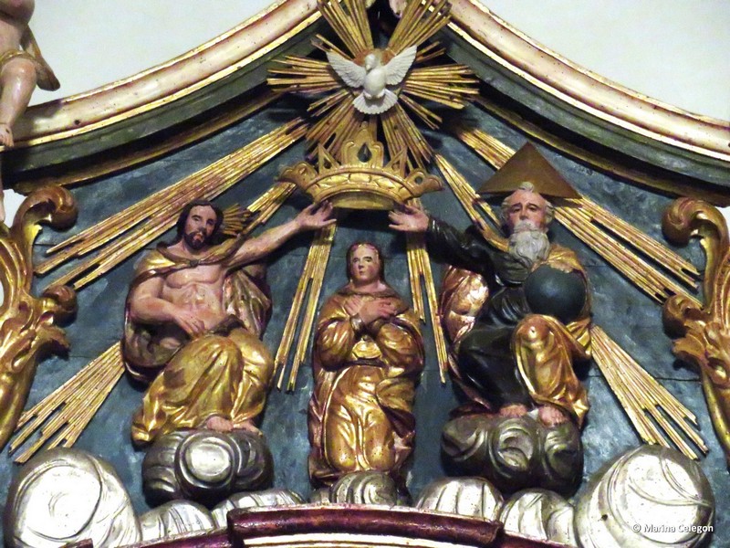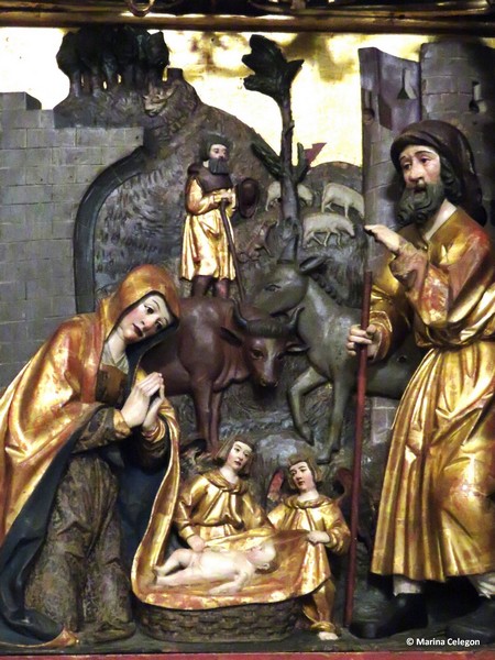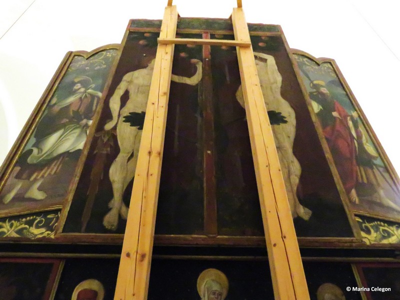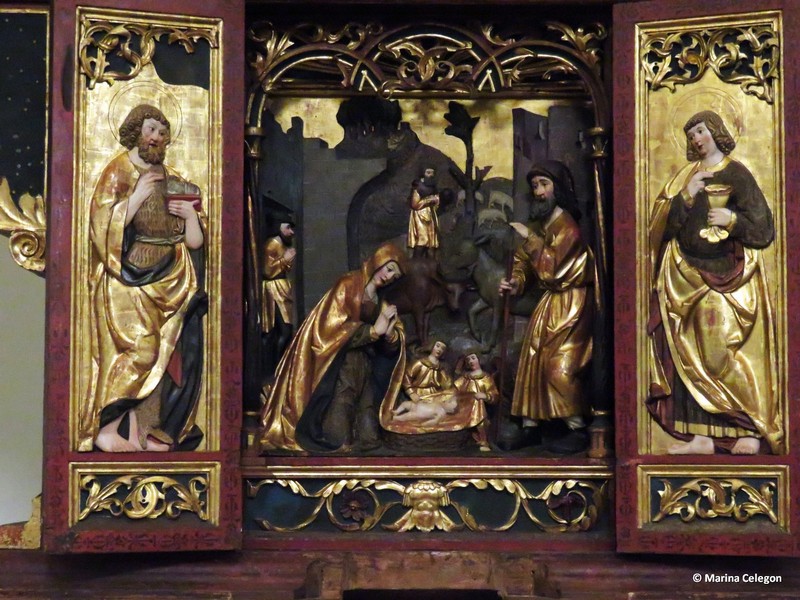Nella parte inferiore nello scrigno, di minore dimensione, è scolpita a rilievo la natività e sugli sportelli aperti le figure in rilievo dei Santi Giovanni Battista e Giovanni Evangelista. A sportelli chiusi si vedono al centro le figure a rilievo dell’Annunciazione ed ai lati, in due nicchie, due statuine dei Santi Rocco e Maurizio che restano coperte quando gli sportellini sono aperti. Sul retro della parte inferiore dell’altare è dipinta la Veronica tra i Sant’Antonio Abate e un altro Santo.