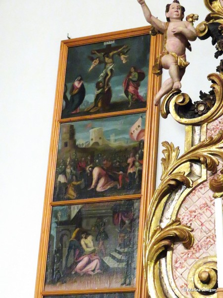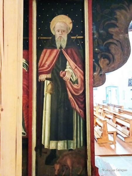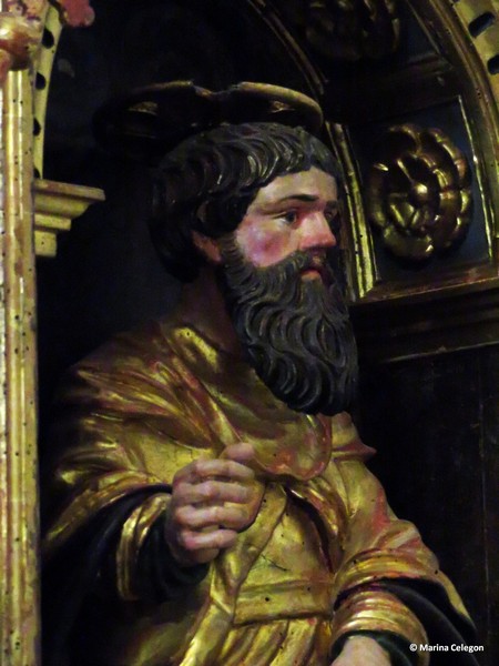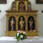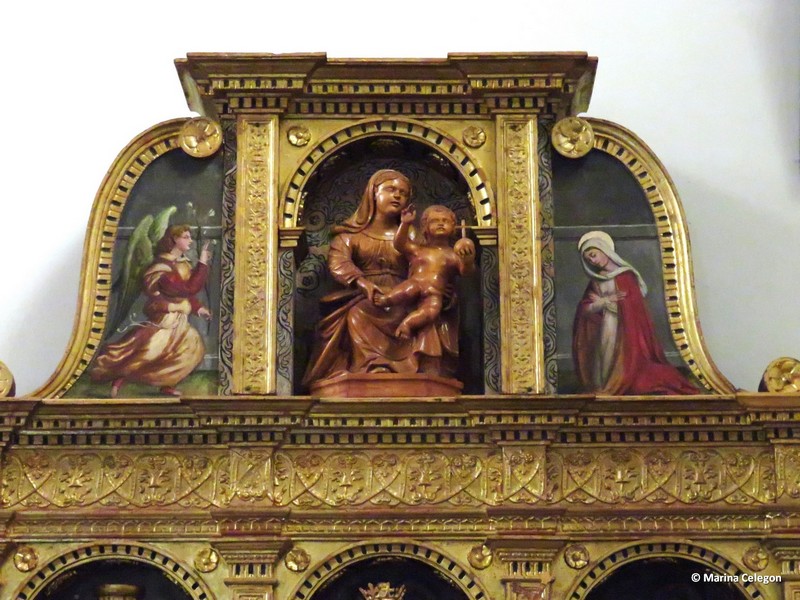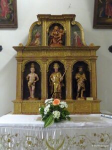 Addossato alla parete alla destra dell’arco trionfale si vede un piccolo altarolo la cui struttura architettonica di tipo rinascimentale, con larga trabeazione e pilastrini con capitello, e con una decorazione minutissima e gradevole hanno portato all’attribuzione a Pietro Floreani o ad Antonio Tironi. Oggi è attribuito a Simone di Paolo, artista poco noto annoverato tra gli aiuti del più famoso Giovanni Martini, che lo eseguì tra il 1528 e il 1538. Documentata è la sua realizzazione dell’altare della parrocchiale di Mione mentre, come questa, anche altre opere un tempo attribuite ad altri gli vengono assegnate per confronto stilistico.