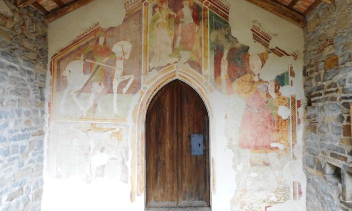 Notevoli affreschi decorano la volta e le pareti del presbiterio, nonché la facciata dell’arco trionfale con scene di Caino e Abele e sotto di S. Cristoforo e San Rocco.