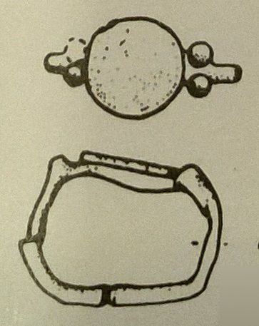 Quest’esemplare, rinvenuto ad un dito della mano sinistra della defunta, presenta il cerchio ricomposto da tre frammenti ed è mancante di una sferetta. Inoltre probabilmente la piastra recava una decorazine non più leggibile.