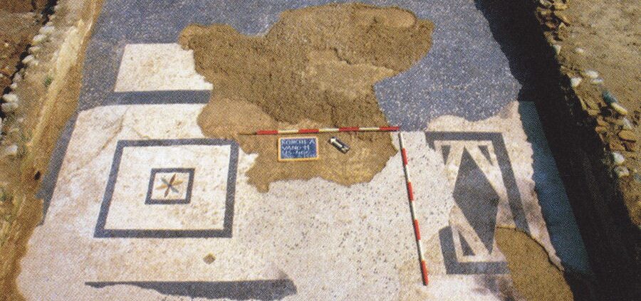 A sud e a nord dei due pannelli si osservano ampie risarciture realizzate con tessere bianche e nere, riferibili a fasi successive. Nella porzione settentrionale resta soltanto un piccolo frammento del mosaico appartenente alla fase precedente, caratterizzato da un campo bianco delimitato da una fascia marginale nera e da una seconda fascia più sottile, anch’essa nera, che separava quest’area da quella con i due pannelli.