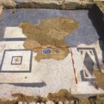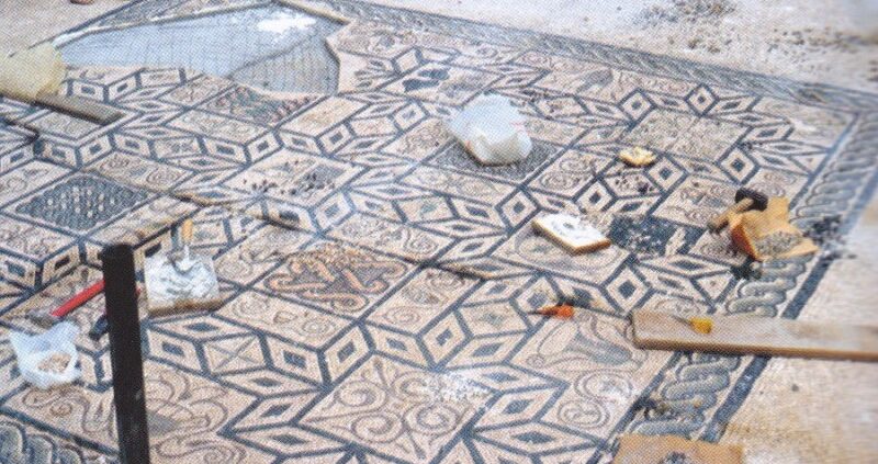 Nell’ambito della villa romana, si segnala anche un mosaico policromo su fondo bianco. Al centro si sviluppa un ampio tappeto incorniciato da una treccia policroma a due capi.