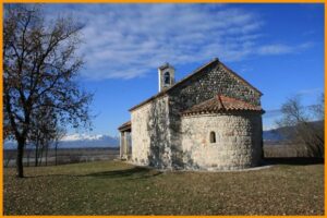 Abside bassa e poco profonda con semicalotta alla stessa quota del pavimento dell’aula; con finestrella a meridione affiancata da nicchia rettangolare.