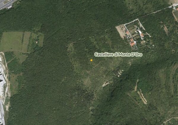 Il castelliere di Monte D’Oro (m 147,3 s.l.m) è stato oggetto di ripetute indagini di scavo dopo le prime esplorazioni condotte da Carlo Marchesetti. Lo studioso rilevò una cinta muraria ellittica della lunghezza di 300 metri, delimitante un ripiano entro il quale vi era “…un piccolo cocuzzolo di circa 6 metri d’altezza, nel quale si veggono tracce di costruzioni posteriori…”, ritenute da M. Moretti di epoca medievale.