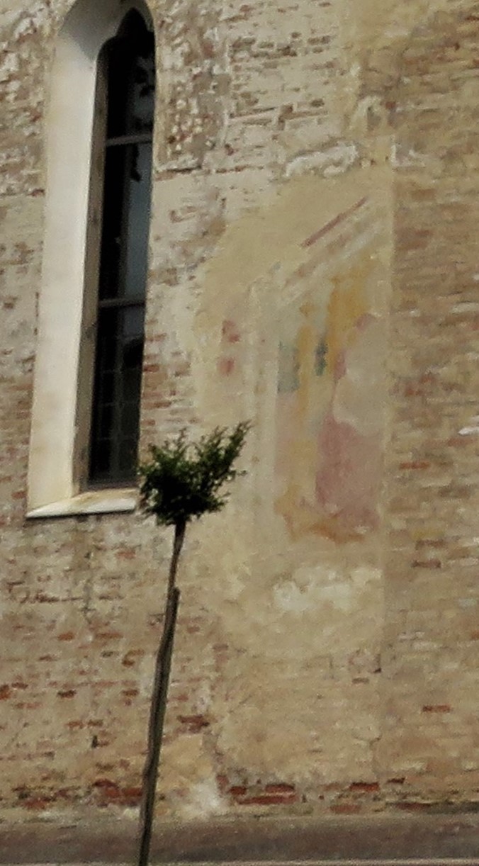 All’esterno, la parete frontale conserva tracce di un S. Cristoforo, quella laterale un affresco, gravemente mutilo e assai corroso dalle intemperie, che rappresenta la Madonna seduta in trono con Bambino. Per motivi stilistici e per la somiglianza con altre opere del pittore, quest’ultimo è stato attribuito al Bellunello e datato attorno al 1490.