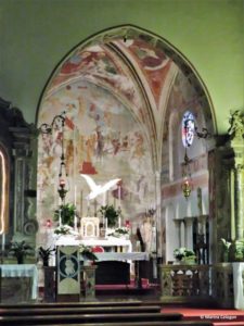 Dell’antica chiesa rimangono certamente il coro e un muro perimetrale. All’esterno, sulla parete destra dell’aula e nell’abside sono visibili gli affreschi emersi negli anni cinquanta del secolo scorso.