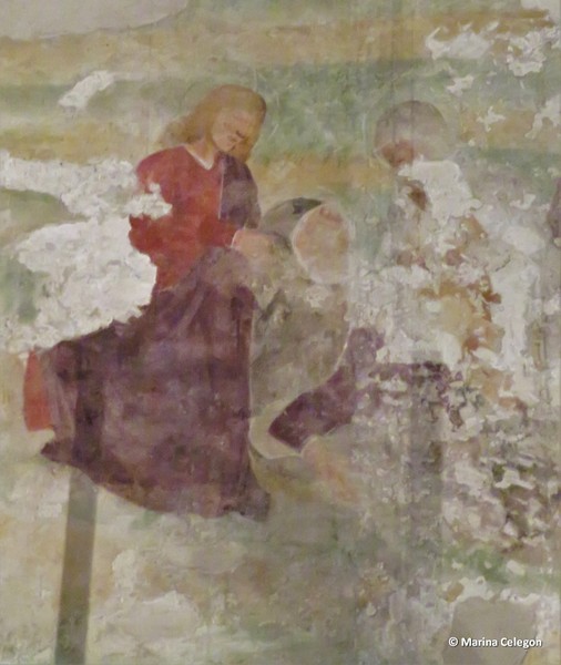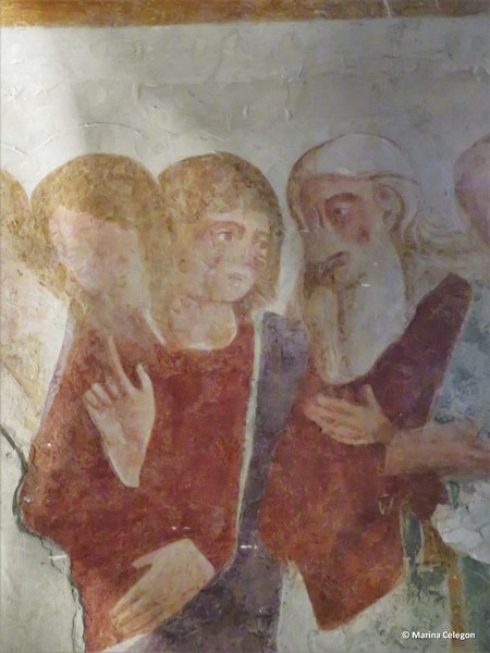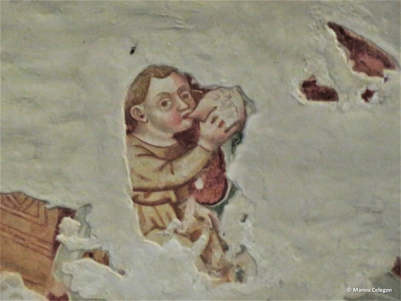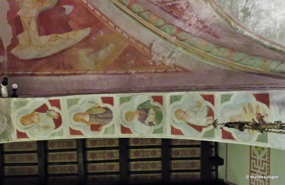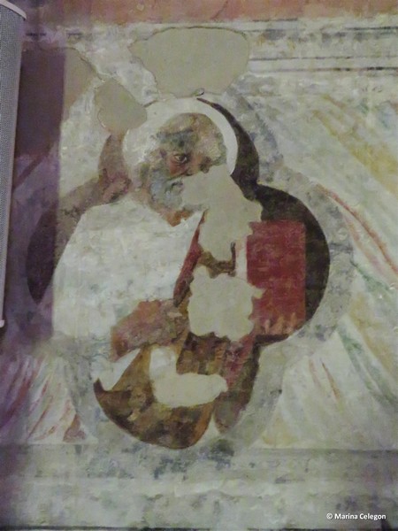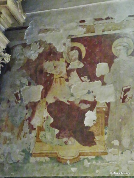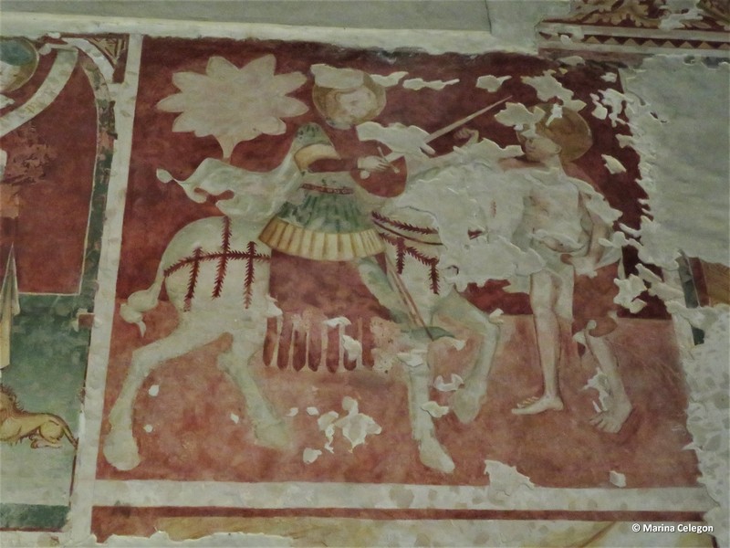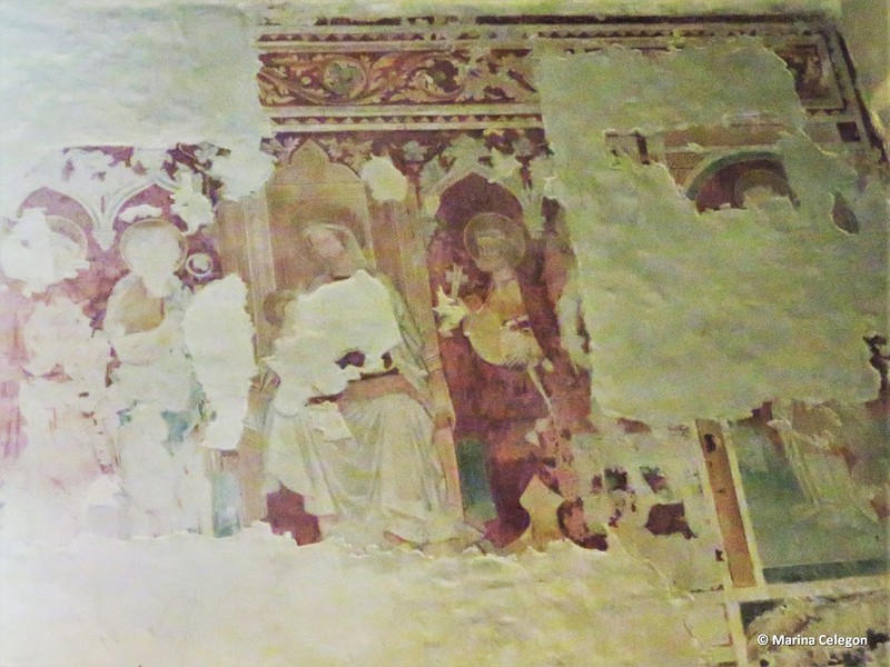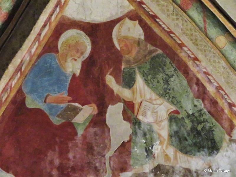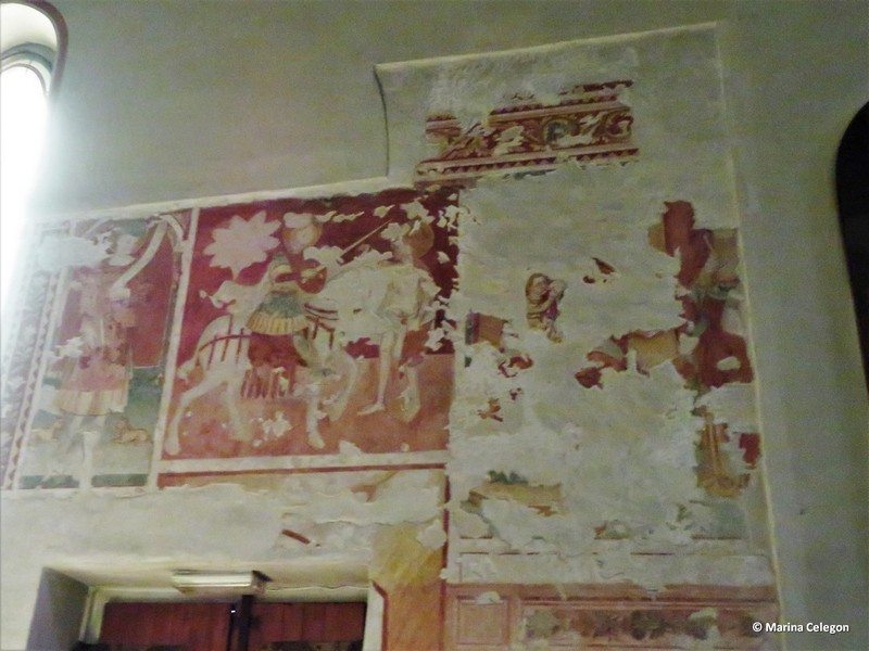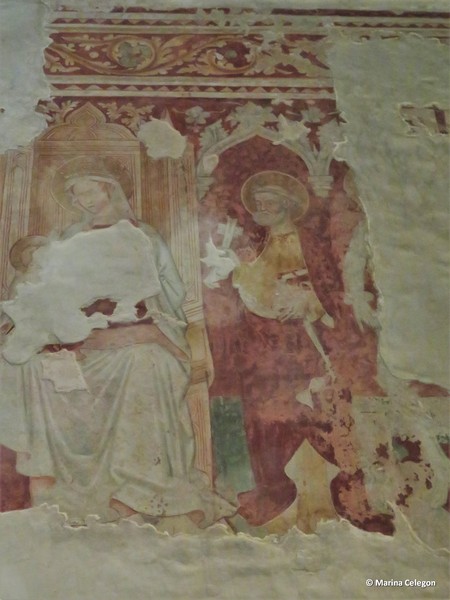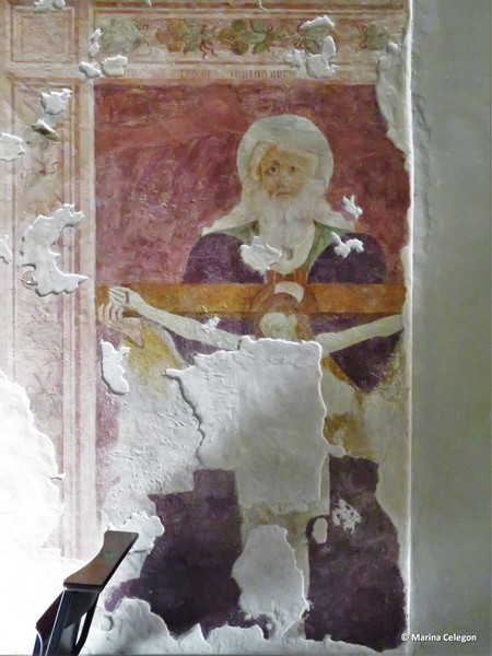 Allo stesso pittore è riferita anche una Trinità presente sulla parete sud dell’aula. Sulla stessa parete compaiono anche altri affreschi: una Madonna seduta con il bambino in braccio e ai lati S. Francesco e S. Antonio; un altro santo e un San Martino a cavallo. Seguono una serie di lacerti poco leggibili tra cui un angioletto in atto di bere da una brocca. Al di sotto si colloca la Trinità attribuita al Bellunello. Più oltre, vicino alla porta principale, si vede un’altra Madonna con il Bambino e S. Pietro ed altri santi, in gran parte poco leggibili. Questa serie di dipinti, collocati in riquadri delineati da cornici fanno pensare che un tempo gli affreschi ricoprissero tutta la parete.