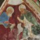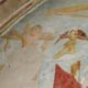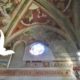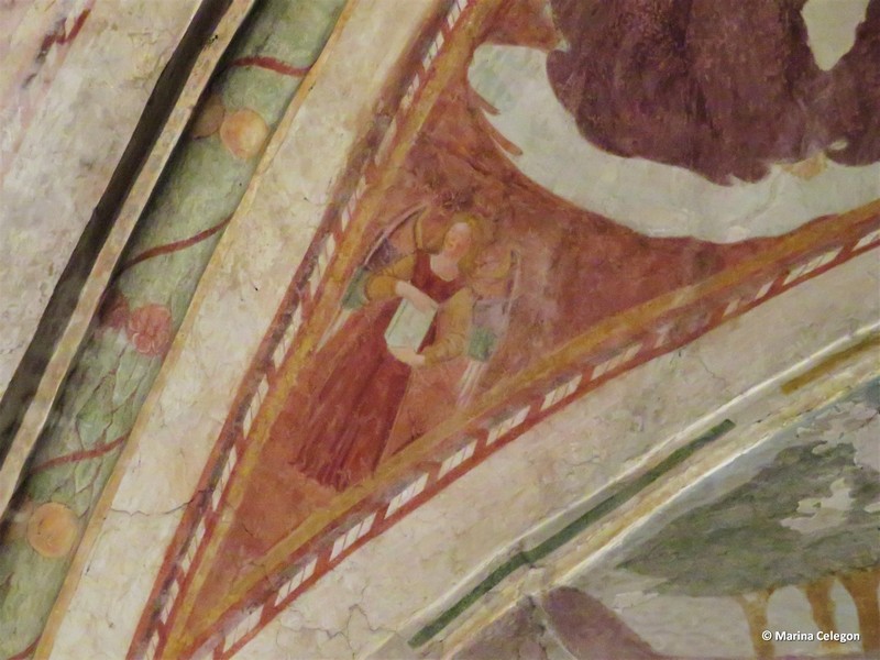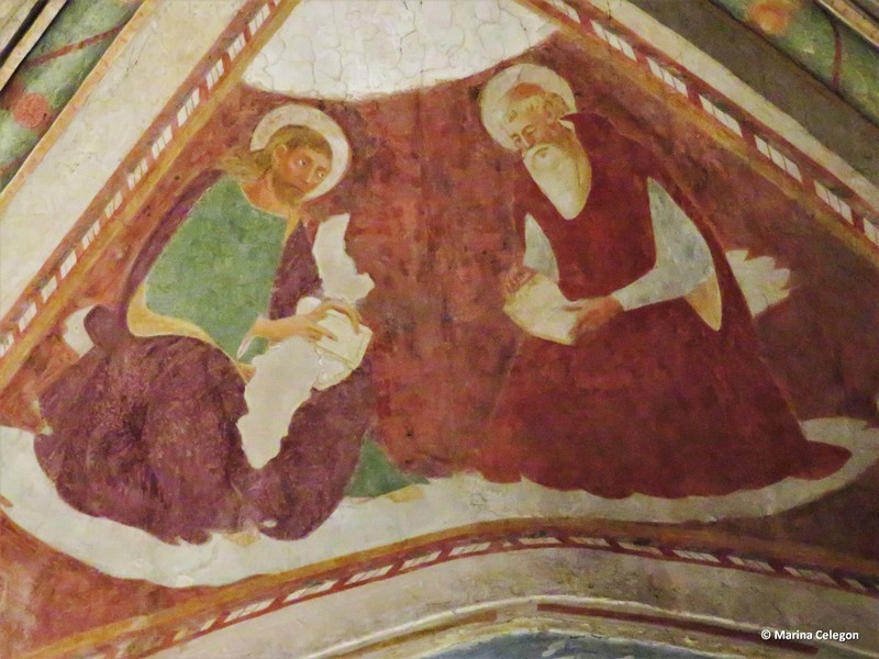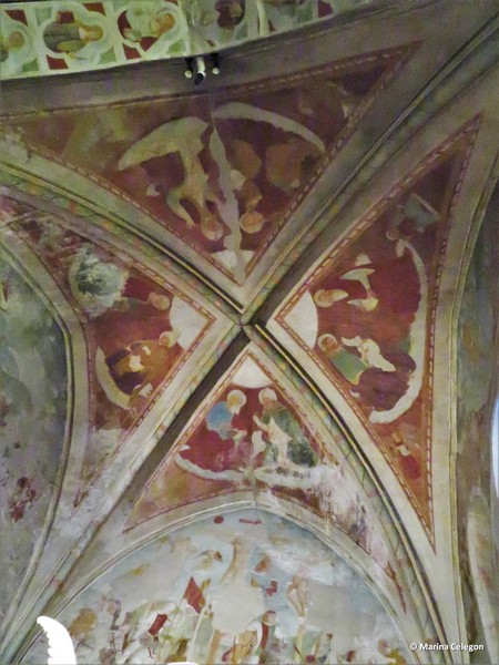 Anche il coro doveva essere completamente affrescato, anche se quel che rimane è frammentario a causa dei danni provocati dal tempo, dalle modifiche alle finestre e dall’apertura di due aule che si affacciano direttamente sul coro. Sulla volta a crociera, in quattro scomparti, sono dipinti gli Evangelisti e i Padri della chiesa, seduti e con un libro aperto in mano. In basso, più piccoli, i simboli degli evangelisti e quattro piccole scene, scarsamente leggibili, della vita di Gesù: Natività, Infanzia, Battesimo e Resurrezione.