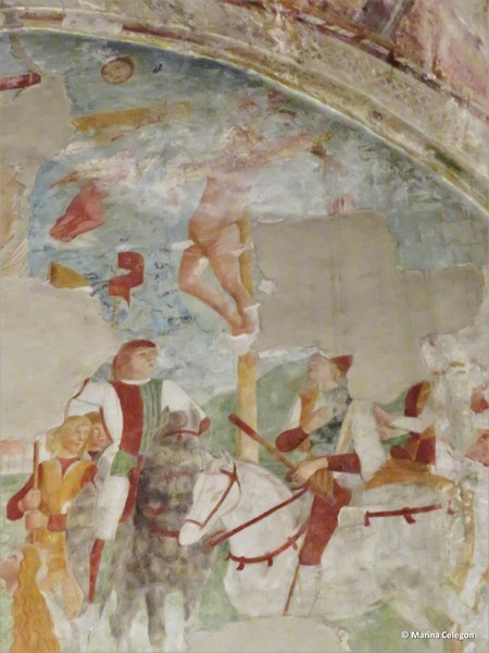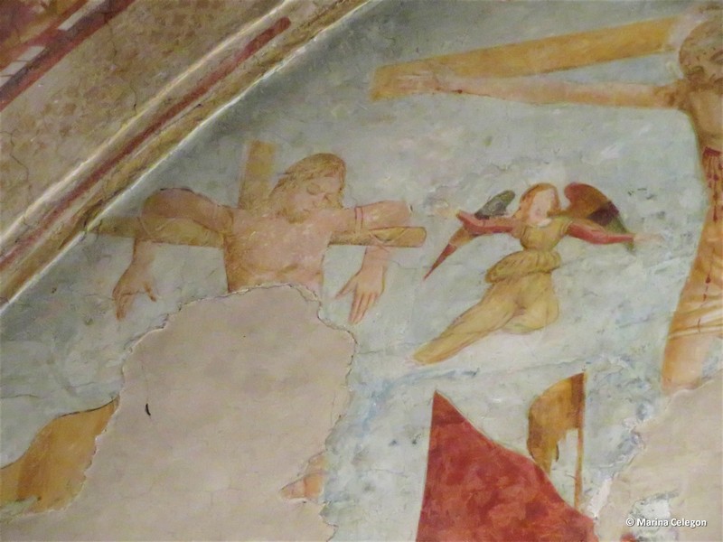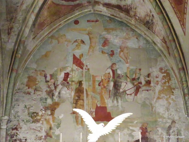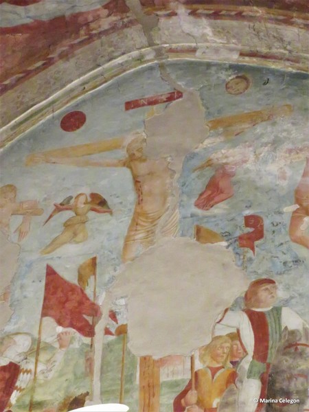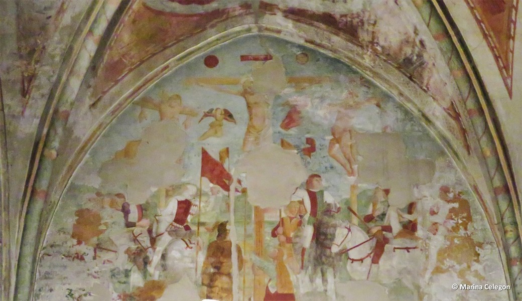 Nella parete di fondo, lesionata anche dai bombardamenti della Seconda guerra mondiale, vi è una Crocifissione molto deteriorata. Ai piedi della croce sono ancora visibili le figure delle pie donne e della Madonna, così come la Maddalena che abbraccia la croce. Ai lati del Cristo si vedono le croci dei due ladroni. Tutto attorno si affollano i soldati romani a piedi e a cavallo. Tutte queste figure sono abbigliate alla moda medievale e sono molto stilizzate nella forma.