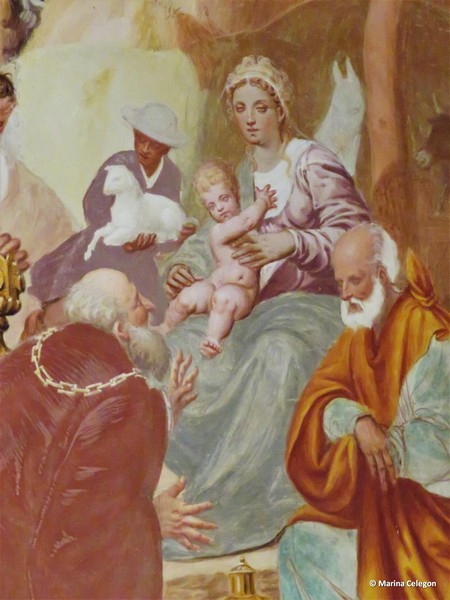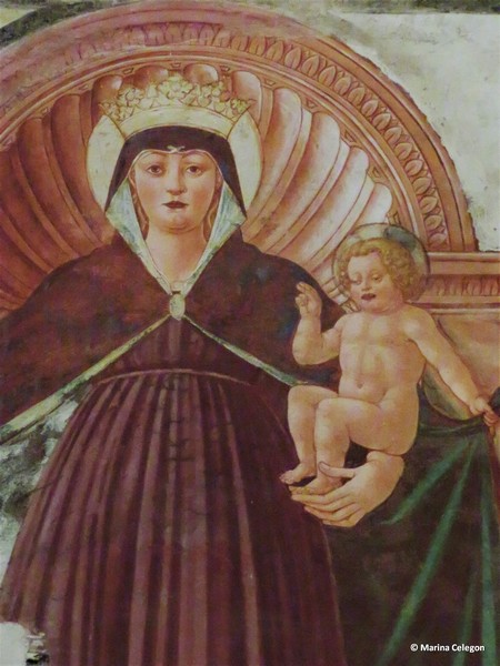 L’affresco più antico presente nella chiesa è attribuito ad Andrea Bortolotti detto il Bellunello, chiamato così perché nato a Belluno verso il 1430. Il pittore, di cui si sa poco, si stabilì a San Vito nel 1455 dove operò fino al 1494, anno della sua morte. L’affresco, sulla parete sinistra della navata, raffigura una Madonna della Misericordia con il bambino ed i devoti. Tra gli esempi più ben conservati del pittore, l’affresco è purtroppo interrotto dall’ingresso alla sacrestia realizzata posteriormente. In tale occasione l’affresco venne anche rimaneggiato nella parte più bassa dove sono percepibili due differenti strati di intonaco, e venne realizzata la cornice in cui si legge l’iscrizione: Verlani, camerario della fradaia 1507.