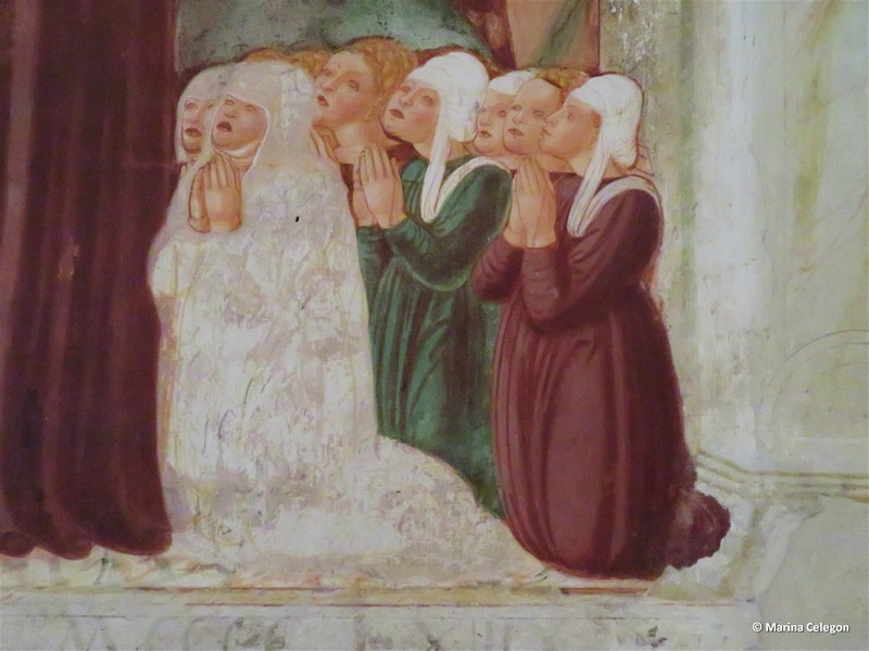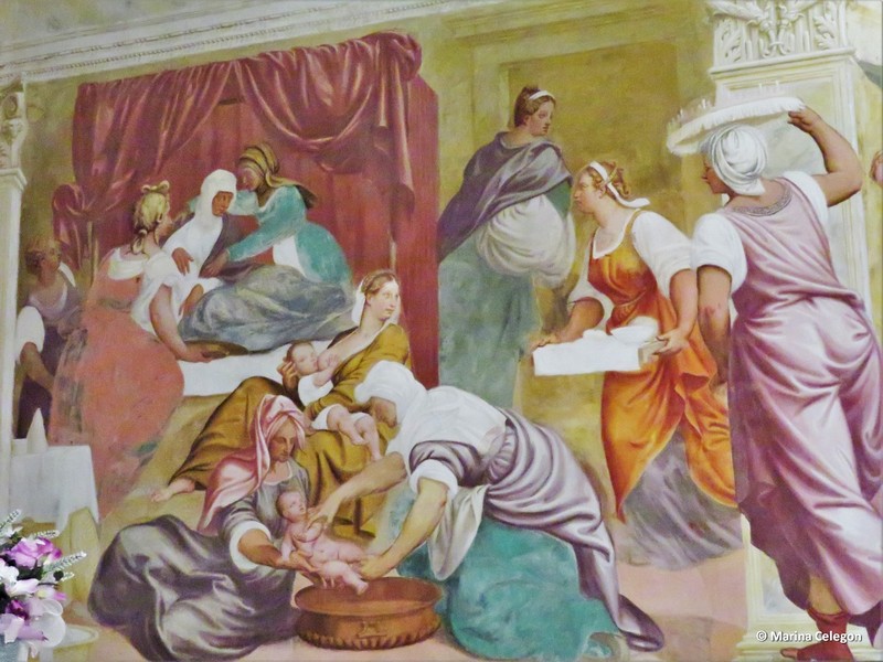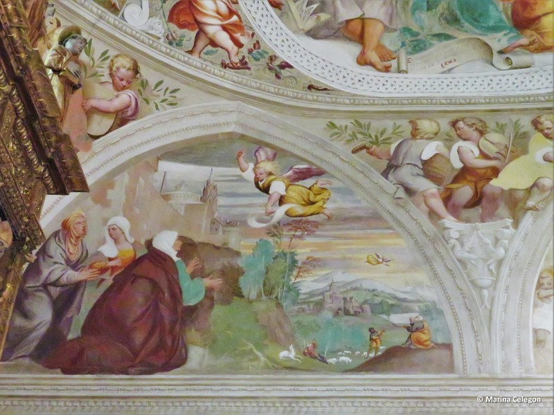 Sulla parete destra in basso si vede la scena della nascita di Maria Bambina ambientata in un ambiente tipico delle abitazioni nobili del Rinascimento. Sopra nelle lunette a sinistra angeli che appaiono a tre pie donne e ordinano loro di far costruire la chiesa e a destra, un episodio dei vangeli apocrifi con l’annuncio ai coniugi Gioacchino e Anna della nascita di Maria. Questa lunetta, come altre, è stata danneggiata dall’annerimento irreversibile dei volti, dovuto alla presenza nei colori di bianco di piombo.