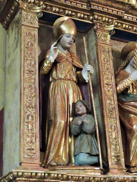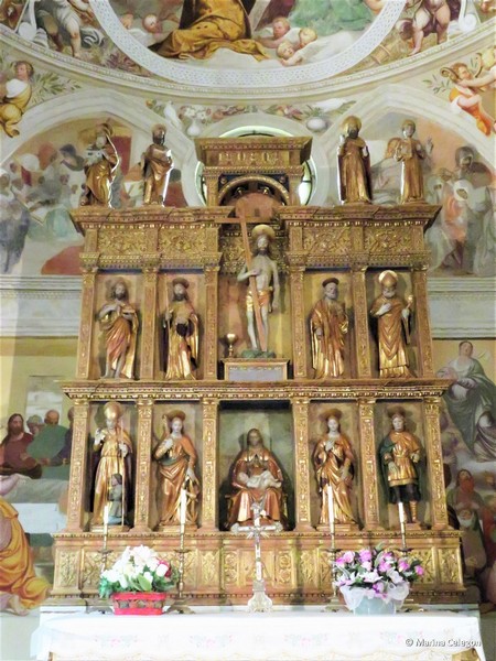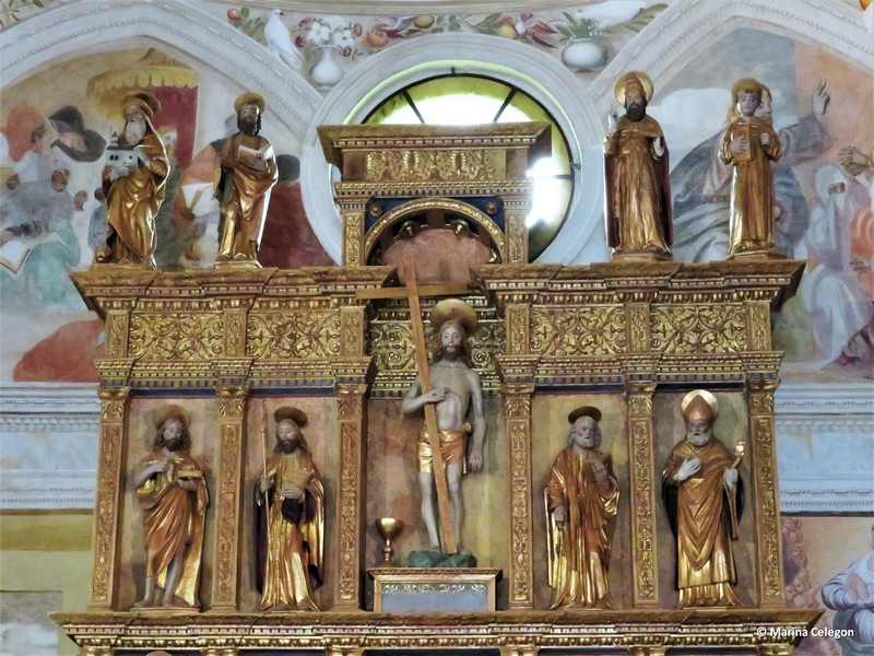 Nell’ordine inferiore sono collocate al centro la statua della Madonna in trono con bambino e i santi Biagio, Caterina d’Alessandria d’Egitto, Margherita e Vito. Nel piano superiore al centro il Redentore con la croce in mano e i santi Giovanni Battista, Giacomo Minore, Pietro e Gottardo. Sulla cimasa sono le statue dei santi Girolamo, Paolo (per altri Nicolò), Gregorio Magno e Antonio da Padova. Al centro della predella vi è un bassorilievo raffigurante Cristo morto che sorge dal sepolcro. Anche se il recente restauro ha volutamente mantenuto la disposizione precedente delle statue, è probabile che alcune di esse in origine fossero collocate diversamente.