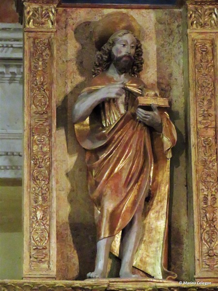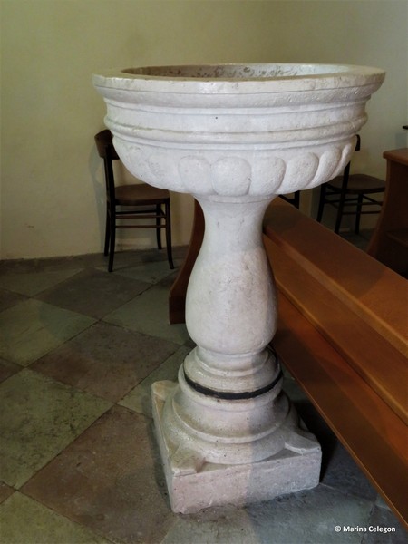 Accanto all’ingresso vi è un’acquasantiera della bottega spilimberghese di Antonio da Carena, meglio conosciuto come il Pilacorte.