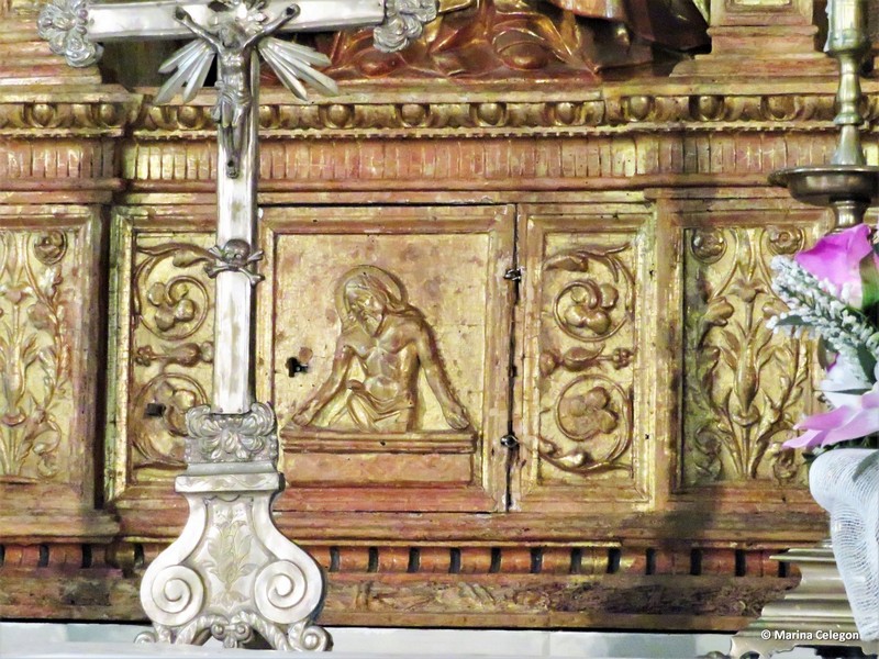 Dai registri della fraterna si sa che l’altare venne consacrato dal vescovo di Concordia Matteo Sanudo il 4 settembre 1594. Alto 350 cm, largo 270 e profondo 40, l’altare si presenta con una struttura architettonica sviluppata su due ordini sovrapposti, divisi da trabeazione e suddivisi in cinque scomparti da piccoli pilastri. L’insieme poggia su un basamento ed è sormontato da un frontone rettangolare con al centro un arco.