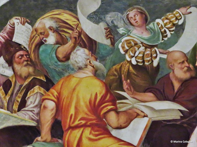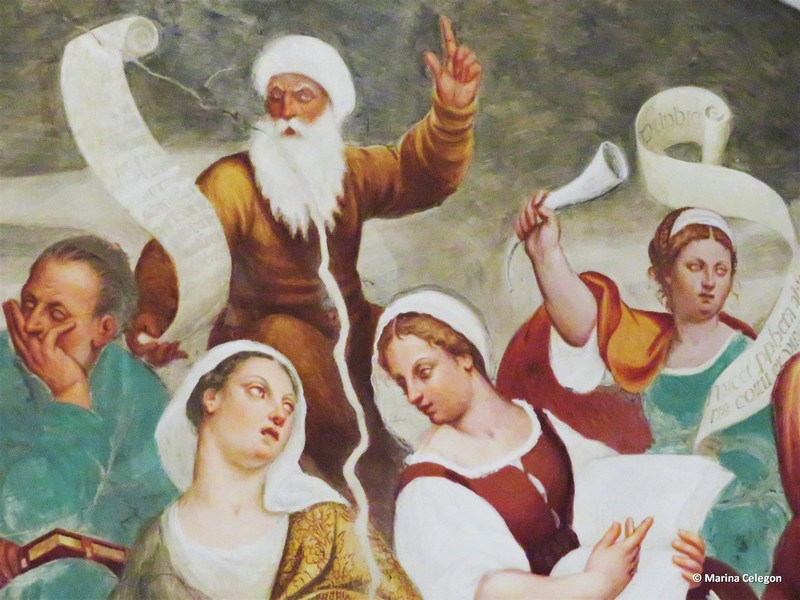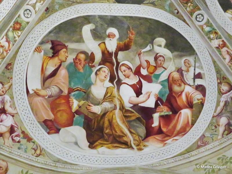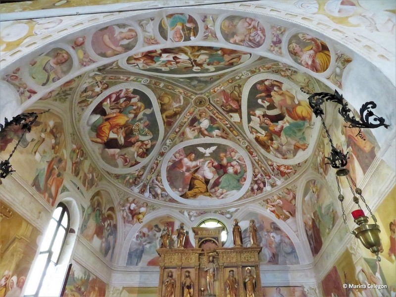 A Prodolone gli affreschi dell’Amalteo coprono ogni spazio del coro. Nell’apice della finta cupola si vedono i simboli dei quattro evangelisti al di sotto dei quali si trovano quattro ovali. In quello sopra l’altare è rappresentata l’incoronazione di Maria Regina del cielo, negli altri tre scene con Profeti e Sibille.