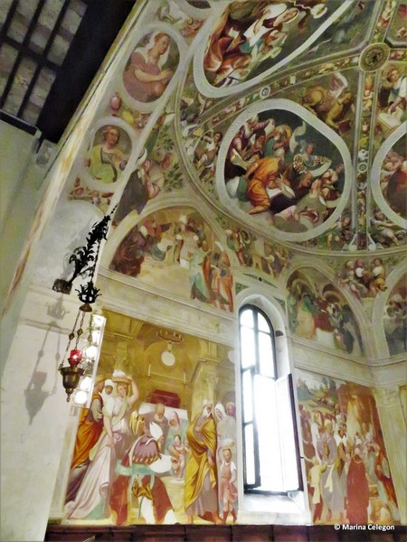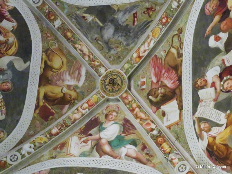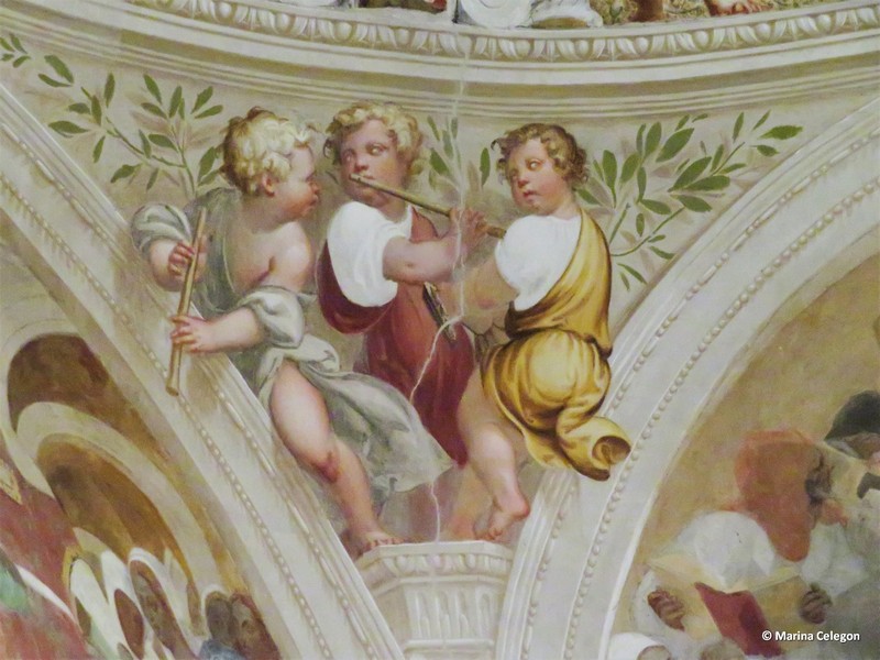 Nelle vele sotto la cupola ai lati dell’arcosanto vi sono a sinistra le figure dei santi Girolamo e Bonaventura ed a destra quelle di Gregorio Magno e Agostino. Nelle due vele dietro l’altare sono rappresentati degli angeli musicanti.