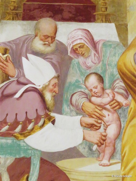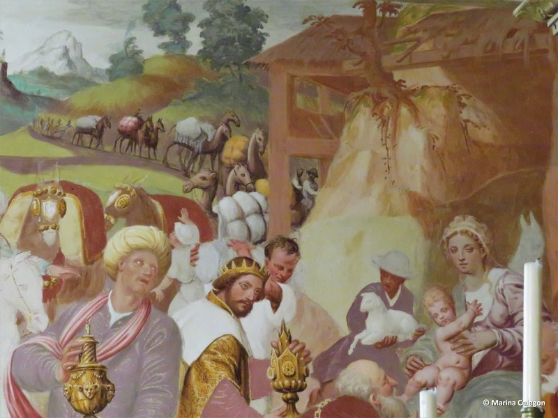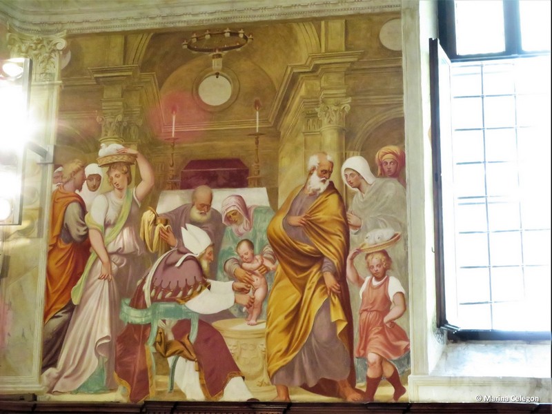 Sulla parete sinistra, ai due lati dell’alta finestra ogivale, vi sono a sinistra la circoncisione di Gesù e a destra l’adorazione dei Magi. Nella scena della circoncisione è presente anche la Madonna cosa che contrasta con gli usi ebraici. Nelle lunette sovrastanti a sinistra la presentazione al tempio di Maria Bambina e a destra lo sposalizio della Vergine Maria con San Giuseppe.
