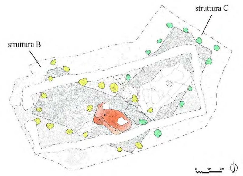Lo scavo condotto successivamente in quest’area ha consentito di riconoscere i resti di tre case, costruite in momenti diversi nella tarda età del bronzo.